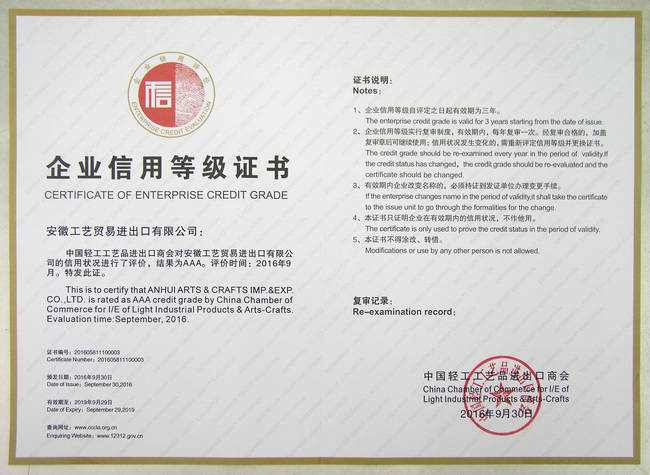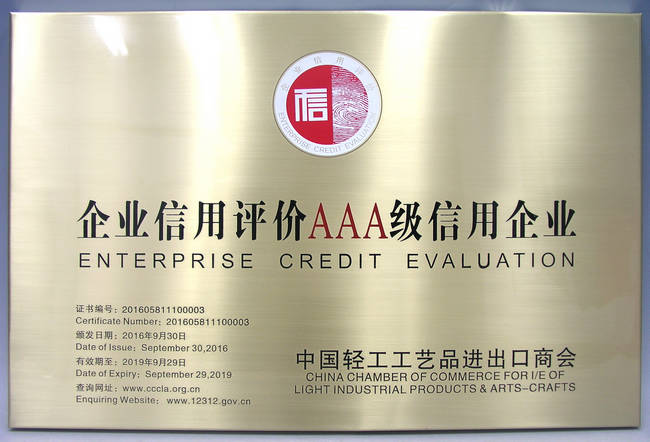 ? ? 公司繼2009年首次獲評(píng)企業(yè)信用評(píng)價(jià)AAA級(jí)信用企業(yè)后,連續(xù)多次獲評(píng)AAA級(jí)榮譽(yù), 并于今年再次被中國輕工工藝品進(jìn)出口商會(huì)授予AAA級(jí)信用企業(yè)證書。